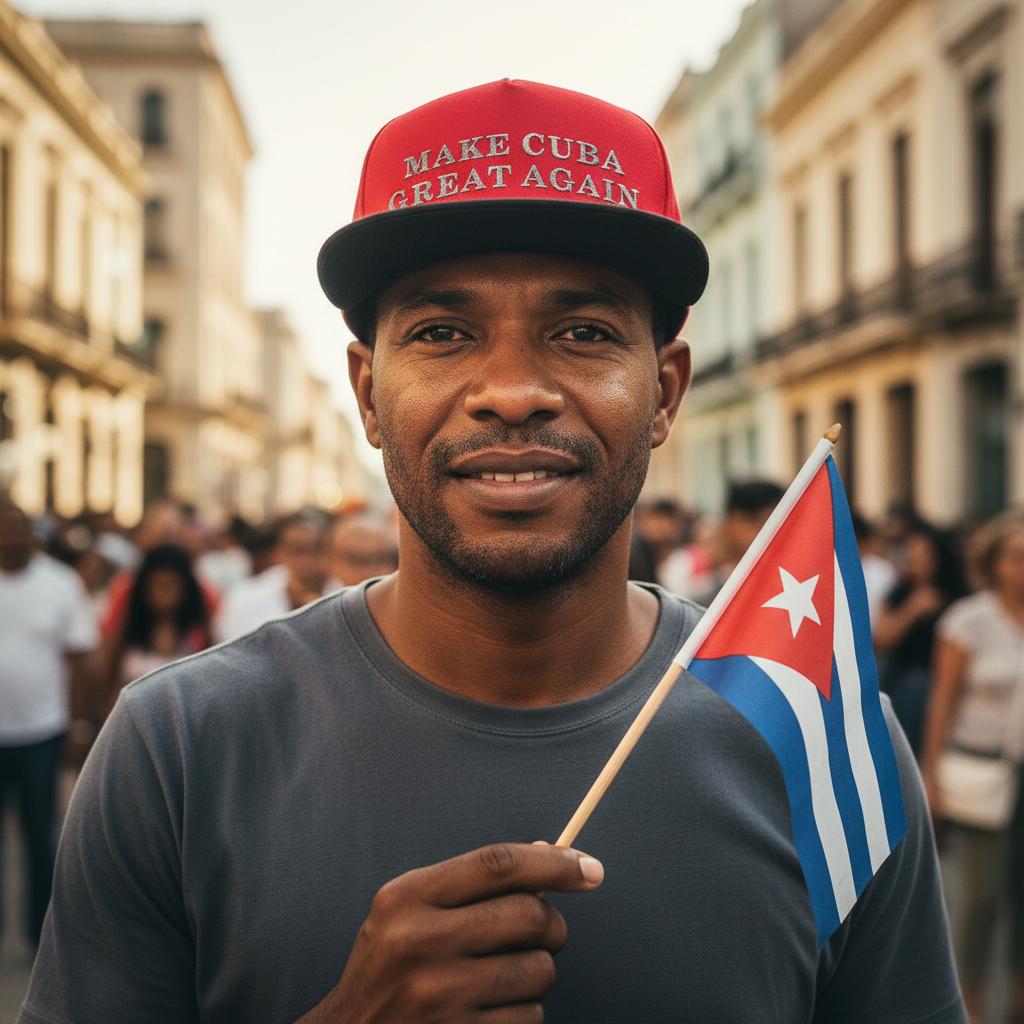 Gorra de color rojo y letrero bordado con hilo blanco: “MAKE CUBA GREAT AGAIN”. Letras en tipografía serif clásica, dispuesta en arco sutil para un acabado elegante.
