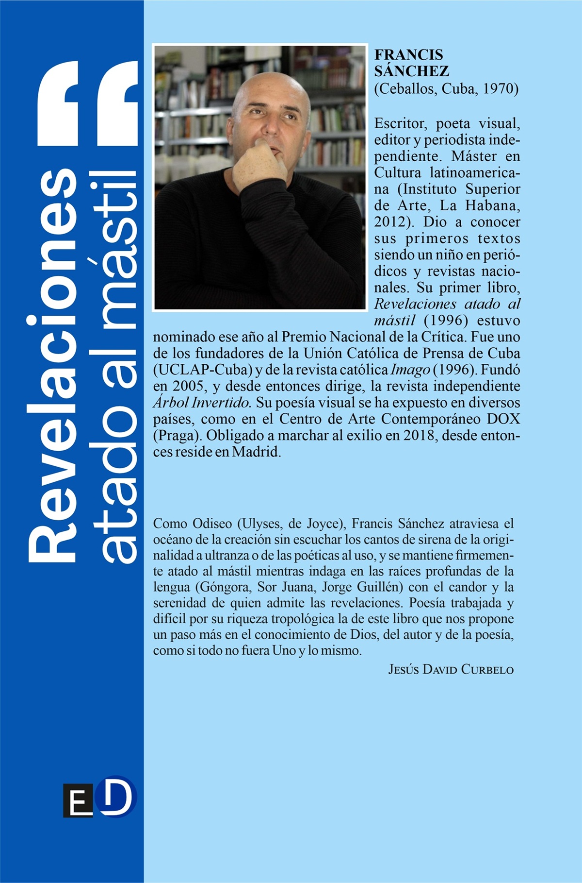 FRANCIS SÁNCHEZ (Ceballos, Cuba, 1970). Escritor, poeta visual, editor y periodista independiente. Máster en Cultura latinoamericana (Instituto Superior de Arte, La Habana, 2012). Dio a conocer sus primeros textos siendo un niño en periódicos y revistas nacionales. Su primer libro, Revelaciones atado al mástil (1996) estuvo nominado ese año al Premio Nacional de la Crítica. Fue uno de los fundadores de la Unión Católica de Prensa de Cuba (UCLAP-Cuba) y de la revista católica Imago (1996). Fundó en 2005, y desde entonces dirige, la revista independiente Árbol Invertido. Su poesía visual se ha expuesto en diversos países, como en el Centro de Arte Contemporáneo DOX (Praga). Obligado a marchar al exilio en 2018, desde entonces reside en Madrid.